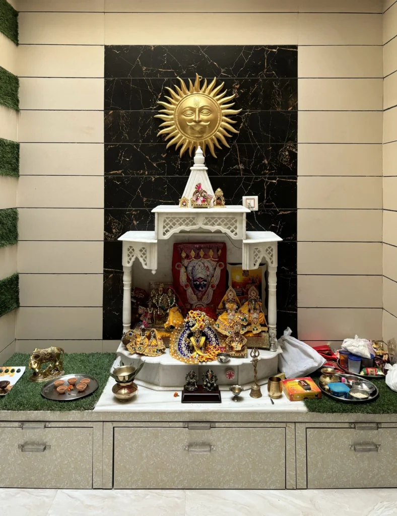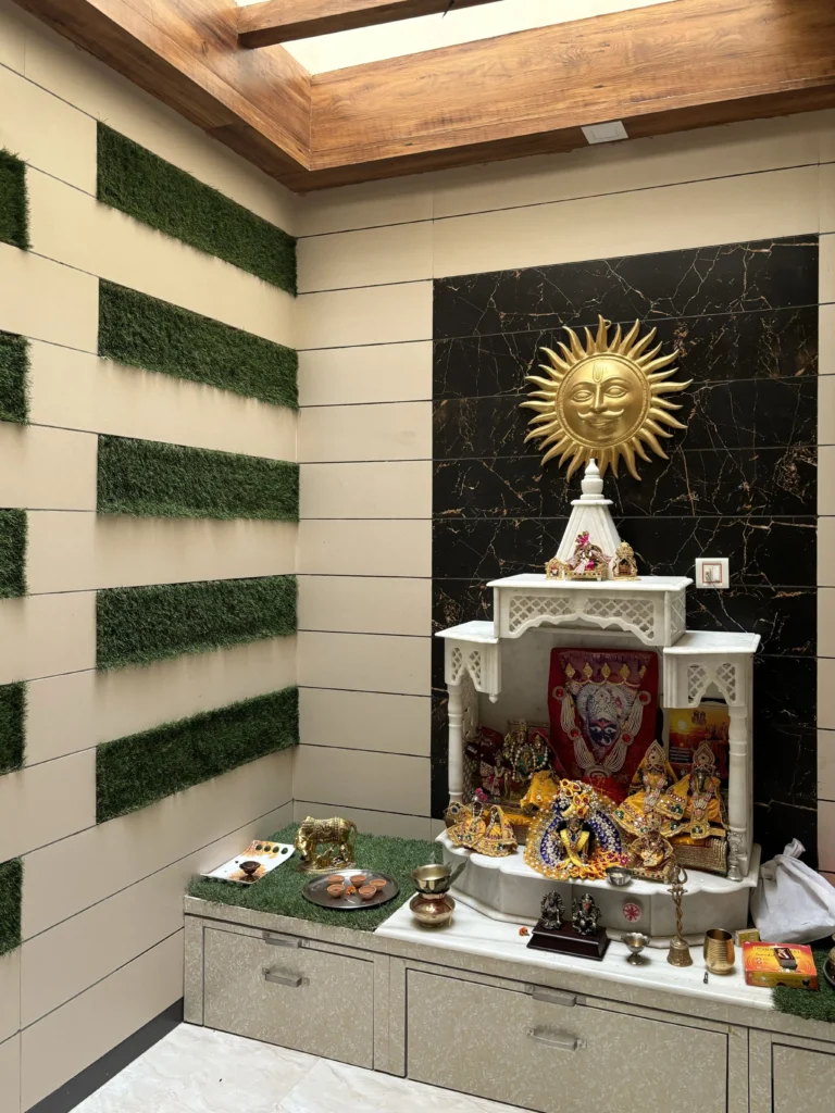 A beautifully designed home temple setup that combines traditional and modern design elements. The focal point is a white marble mandir (temple) with intricate carvings, placed against a black marble wall cladding.