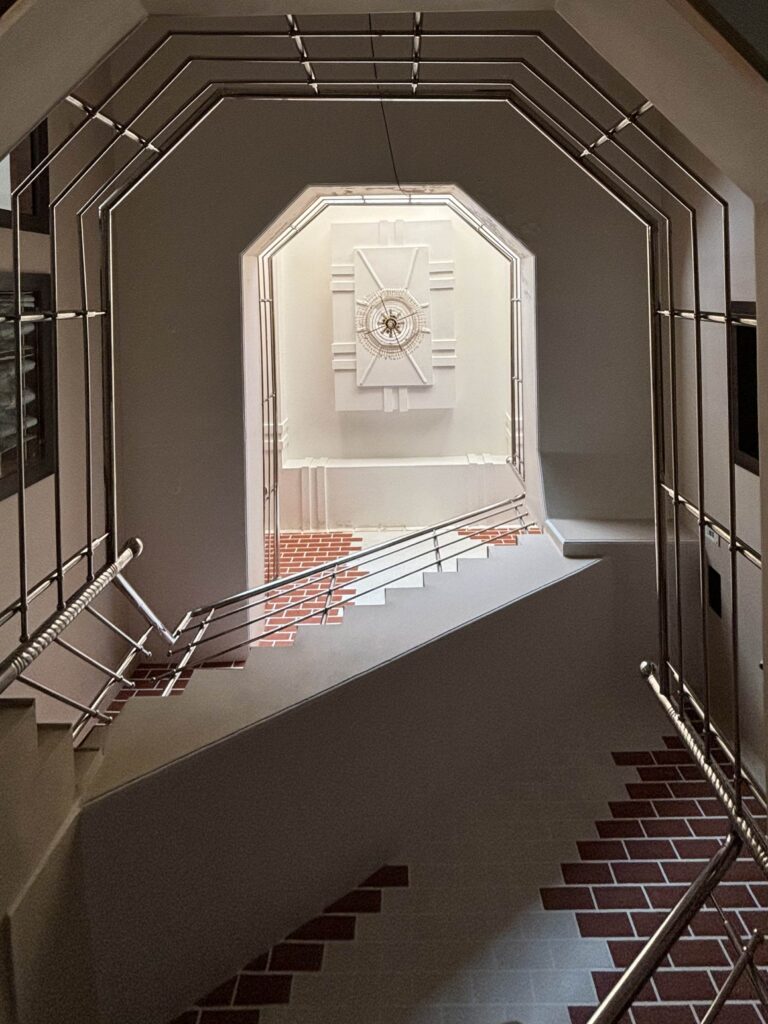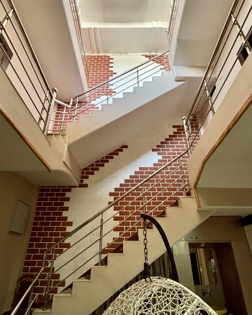 The staircase is constructed with sleek metal railings with marble steps, complemented by walls featuring an attractive mix of exposed red bricks and white painted bricks, creating a dynamic visual pattern. A hanging wicker chair with vibrant red cushions sits in the foreground, adding a cozy and inviting touch to the space.