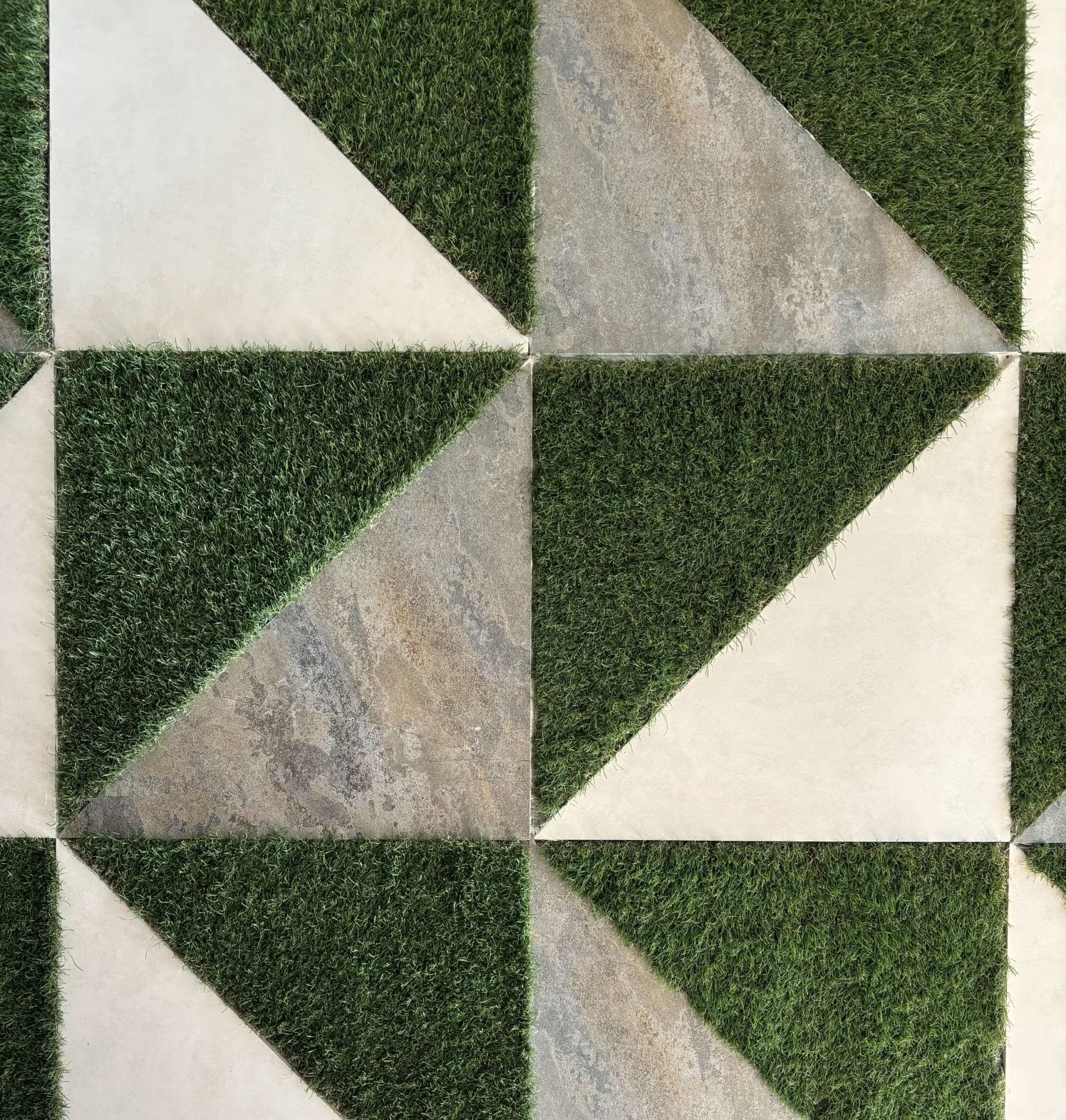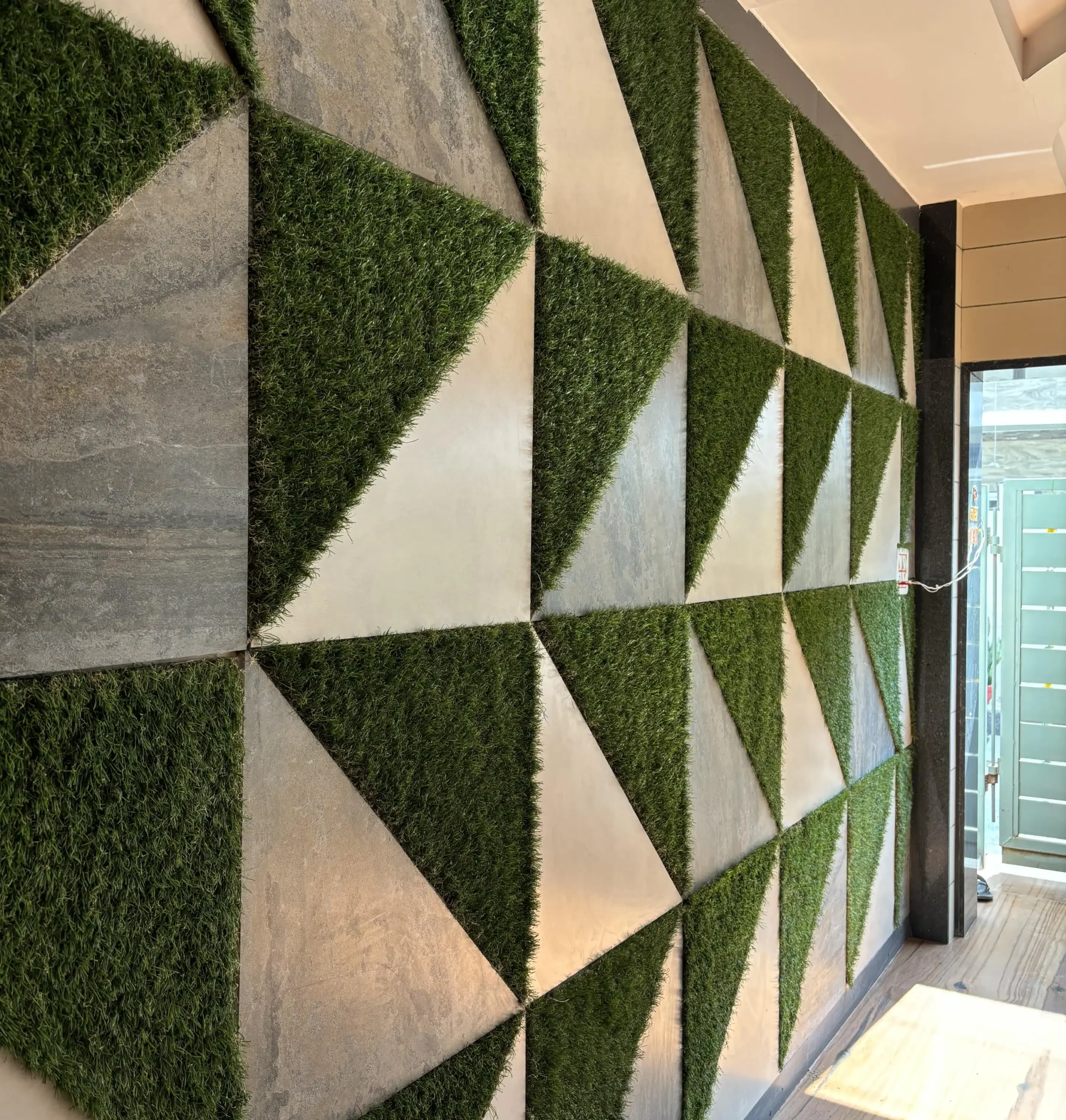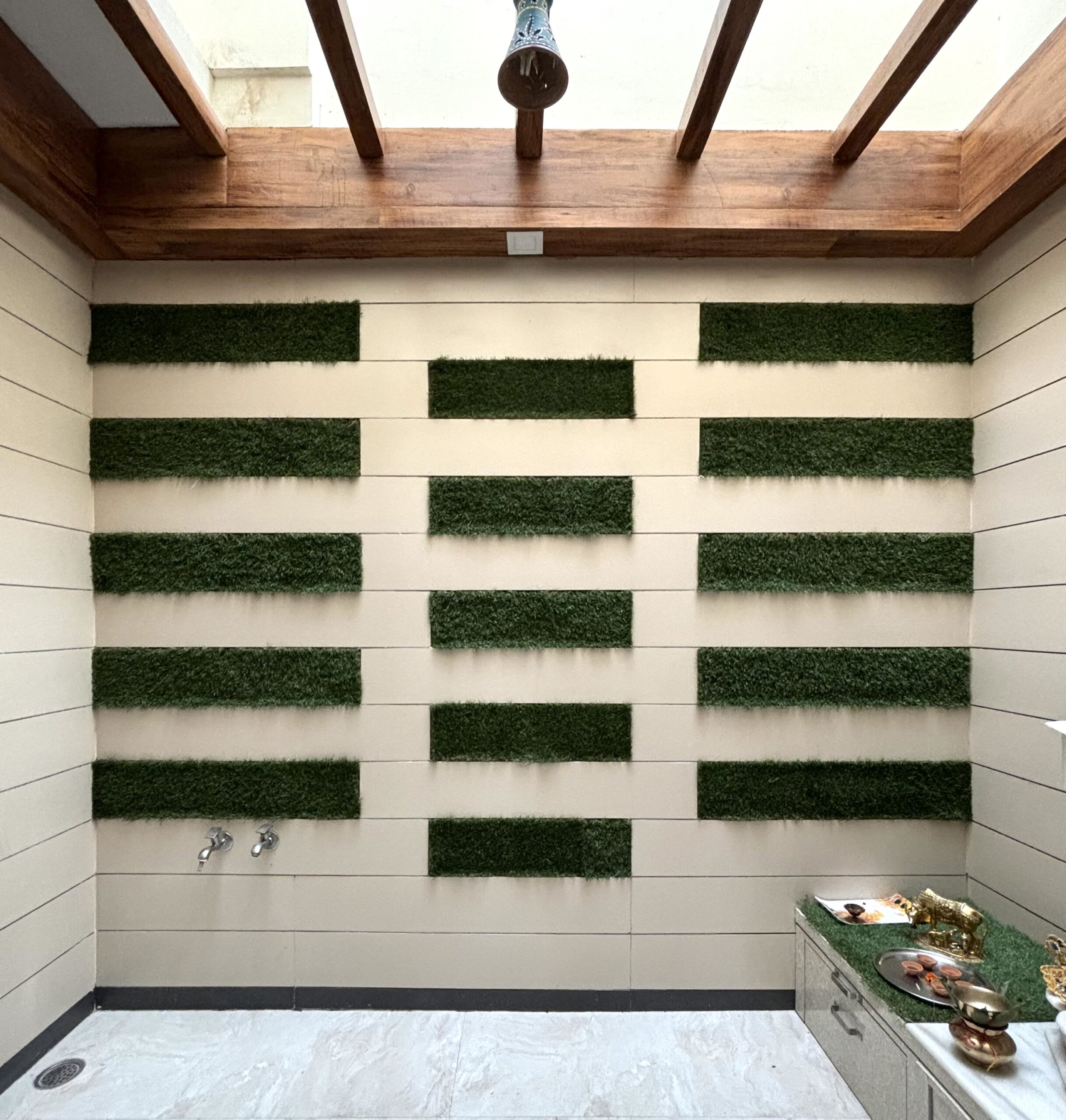 The surrounding walls featuring horizontal paneling with alternating green turf sections. The beige-toned panels provide a neutral background, allowing the lush green turf accents to stand out and create a visually appealing pattern. The green turf sections add a natural, organic touch to the space, balancing the structured look of the beige panels.