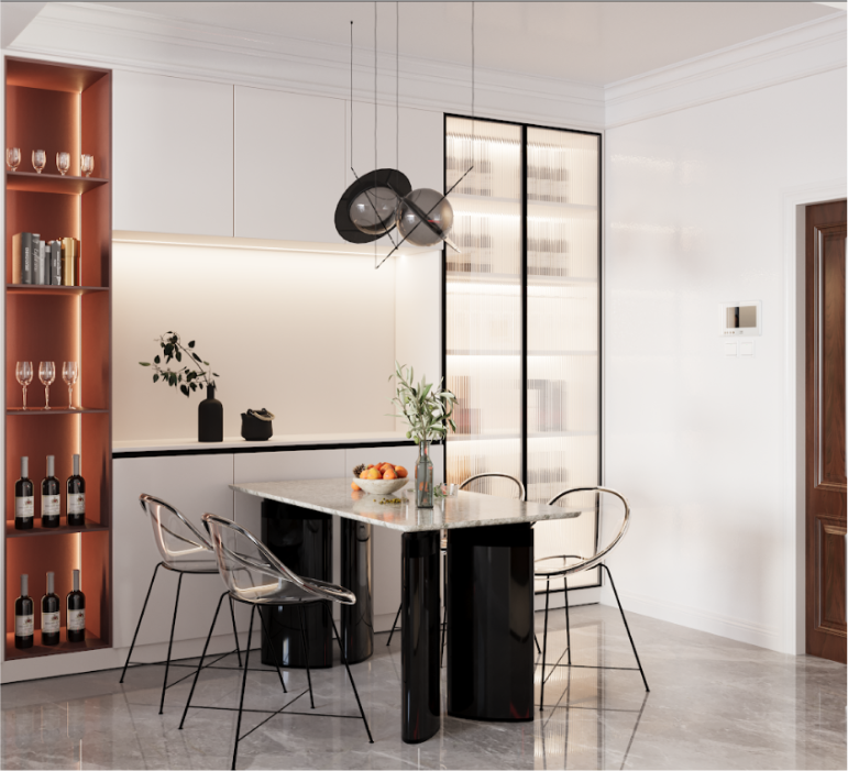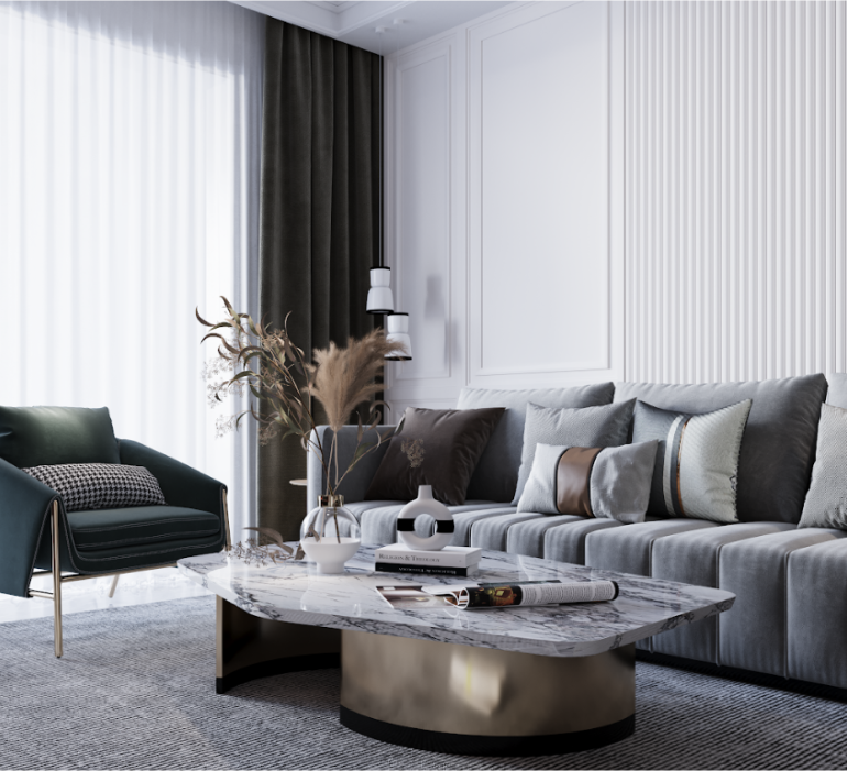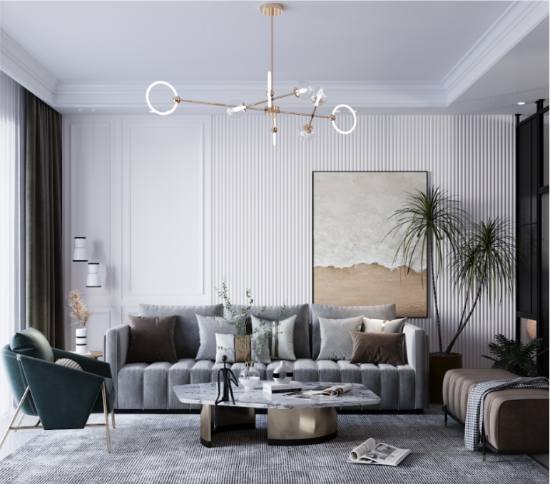 This classy living room interior blends modern elegance with a cozy atmosphere, making it a perfect retreat for relaxation and entertainment. The room’s design highlights a sleek, neutral color scheme with a combination of light and dark grays, beige, and white. The textured wall with vertical grooves adds depth, while the large abstract artwork on the wall brings warmth to the space. A plush, gray sofa with assorted throw pillows enhances comfort, complemented by a stylish, low coffee table with a marble top and a unique base.Tall indoor plants add a natural element, making the space feel inviting and serene.